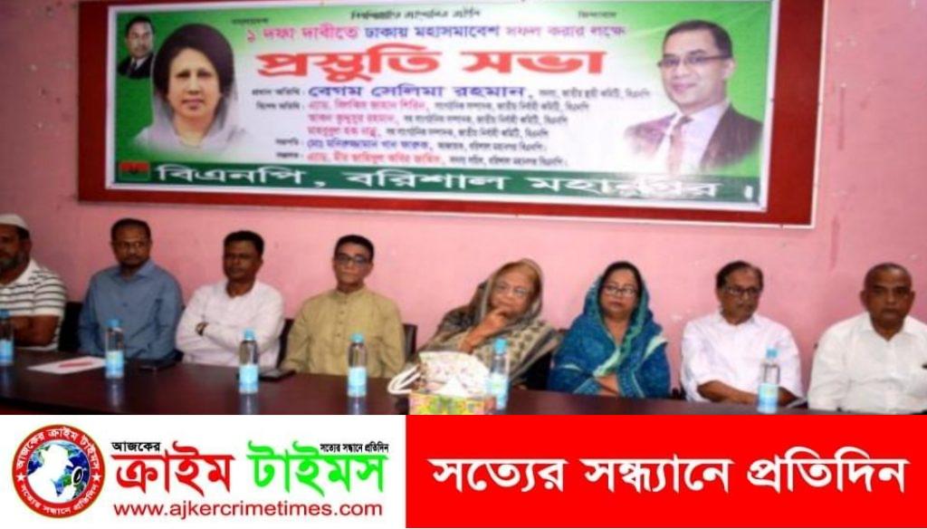 বরিশাল মহানগর বিএনপি আহবায়ক মোঃ মনিরুজ্জামান খান ফারুকের সভাপতিত্বে ও মহানগর বিএনপি সদস্য সাইফুল আহসান আজিমের সঞ্চলনায় প্রস্তুতি সভায় প্রধান অতিথি হিসাবে উপস্থিত থেকে জাতীয় স্থায়ী কমিটির সদস্য বেগম সেলিমা রহমান সমাবেশে অংশগ্রহনের বিষয়ে দিক নির্দশনামূলক বক্তব্য দেন।