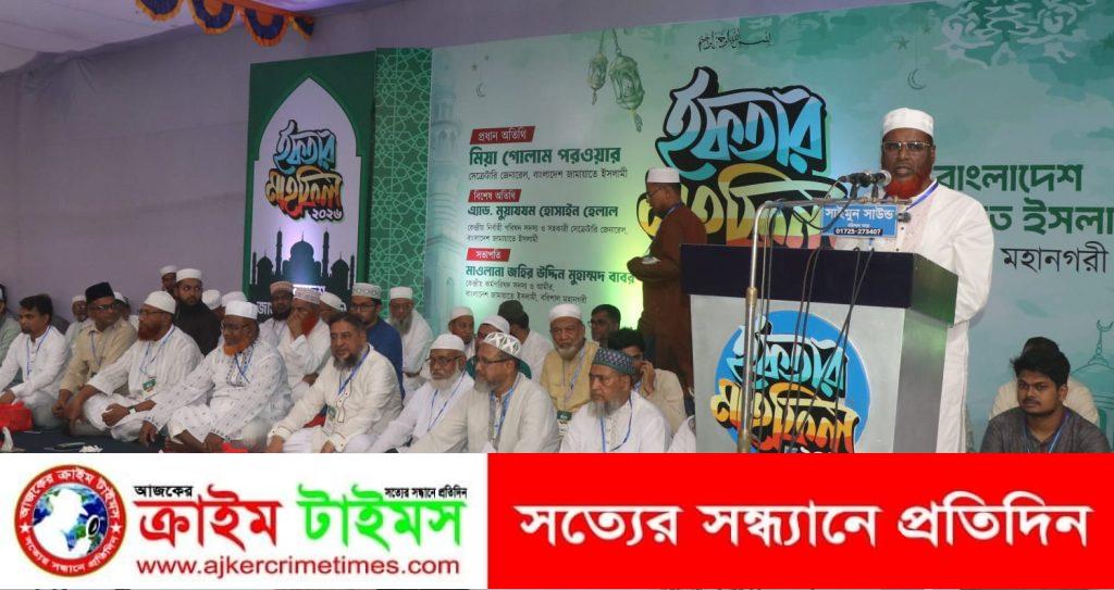 রোববার (৮ মার্চ) ১৮ রমজান উপলক্ষে নগরীর একে স্কুল মাঠে বাংলাদেশ জামায়াতে ইসলামী বরিশাল মহানগরীর আয়োজনে আলোচনা সভা ও ইফতার মাহফিল অনুষ্ঠানে প্রধান অতিথির বক্তব্যে তিনি এসব কথা বলেন।