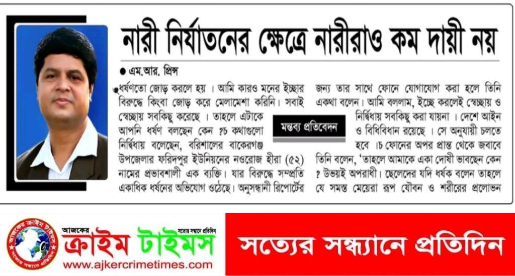 ” ধর্ষণতো জোড় করলে হয় । আমি কারও মনের ইচ্ছার বিরুদ্ধে কিংবা জোড় করে মেলামেশা করিনি । সবাই স্বেচ্ছায় সবকিছু করেছে । তাহলে এটাকে আপনি ধর্ষণ বলছেন কেন ?” কথাগুলো নির্দ্বিধায় বলেছেন, বরিশালের বাকেরগঞ্জ উপজেলার ফরিদপুর ইউনিয়নের নওরোজ হীরা (৫২) নামের প্রভাবশালী এক ব্যক্তি । যার বিরুদ্ধে সম্প্রতি একাধিক ধর্ষনের অভিযোগ ওঠেছে । অনুসন্ধানী রিপোর্টের জন্য তার সাথে ফোনে যোগাযোগ করা হলে তিনি একথা বলেন । আমি বললাম, ” ইচ্ছে করলেই স্বেচ্ছায় ও নির্দ্বিধায় সবকিছু করা যায়না । দেশে আইন ও বিধিবিধান রয়েছে । সে অনুযায়ী চলতে হবে ।” ফোনের অপর প্রান্ত থেকে জবাবে তিনি বলেন, ” তাহলে আমাকে একা দোষী ভাবছেন কেন ? উভয়ই অপরাধী ।ছেলেদের যদি ধর্ষক বলেন তাহলে যে সমস্ত মেয়েরা রূপ যৌবন ও শরীরের প্রলোভন দেখিয়ে ছেলেদেরকে আবেগের ফাঁদে ফেলে সঙ্গ দেয় তাদের উপাধি কি দিবেন ? ।” তার অসংলগ্ন এলোমেলো কথা বার্তায় বিব্রত হয়ে থেমে গেলাম । একটি সূত্র থেকে তার অনৈতিক কার্যকলাপের কিছু ভিডিও সংগ্রহ করলে তাতে দেখা যায় একটি কিশোরী মেয়ে একরকম বিদঘুটে চেহারার বয়স্ক লোকের সাথে অনৈতিক কাজে লিপ্ত এবং যা কিছু করেছে তা স্বেচ্ছায় ও নির্দ্বিধায় । যেমনটি দেখেছিলাম আলোচিত এক মডেল ও অভিনেত্রীর বেলায় । এরকম অসংখ্য অভিযোগের ক্ষেত্রে একই চিত্র দেখা যায় ।