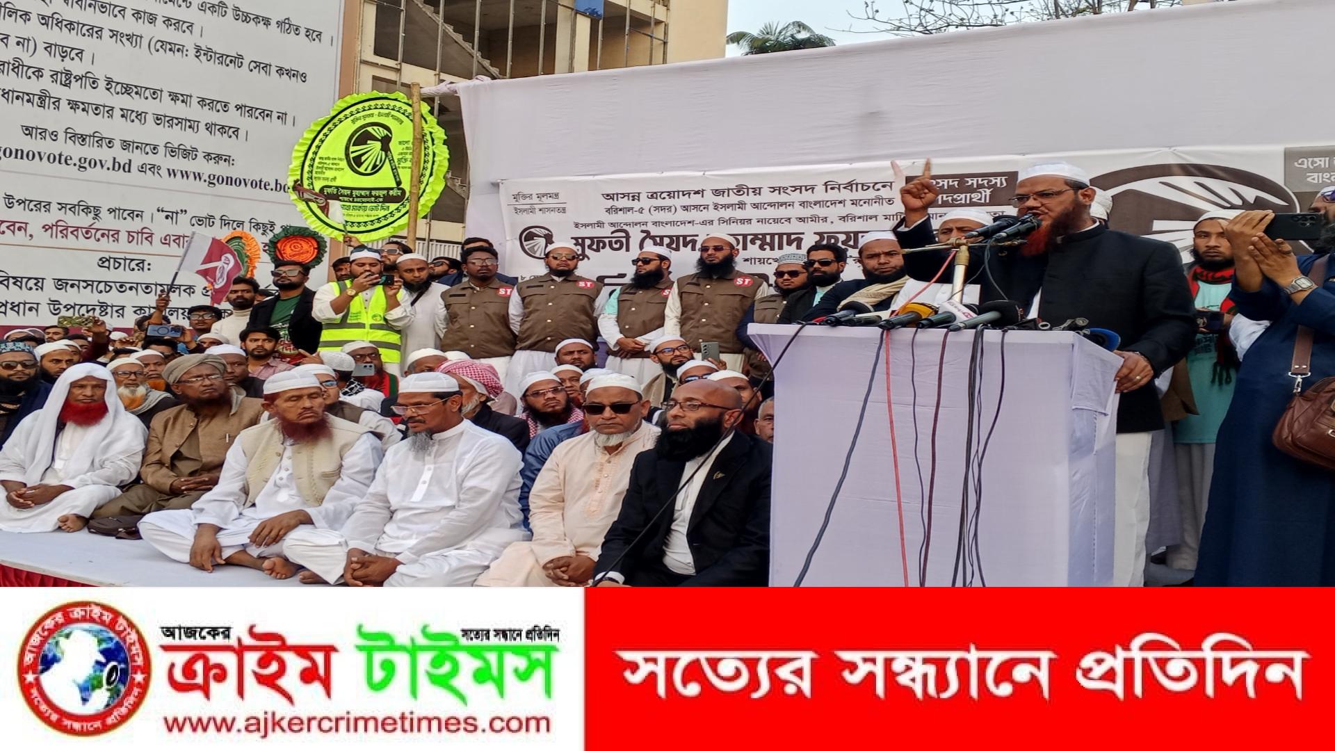 আজ বিকেল ৩টায় বরিশাল শহীদ মিনার প্রাঙ্গণে হাতপাখা প্রতীকের নির্বাচনী জনসভায় প্রধান অতিথির বক্তব্যে তিনি বলেন,“বরিশাল আজ চাঁদাবাজদের কবলে জর্জরিত। সাধারণ মানুষ নিরাপত্তাহীন। এই অবস্থা থেকে মুক্তি পেতে হলে সৎ, ন্যায়ভিত্তিক ও আল্লাহভীরু নেতৃত্ব প্রতিষ্ঠা করতে হবে। সেই লক্ষ্যে সবাইকে হাতপাখায় ভোট দেওয়ার আহ্বান জানান।”