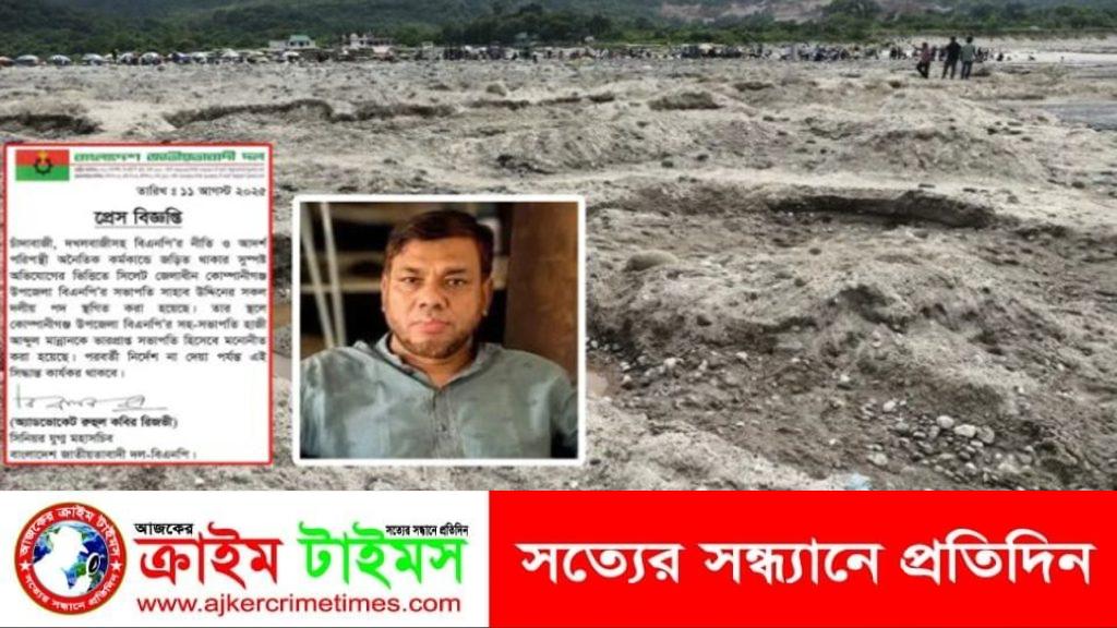 নিউজ ডেস্ক :: চাঁদাবাজি, দখলবাজিসহ দলীয় নীতি ও আদর্শবিরোধী কর্মকাণ্ডে জড়িত থাকার সুনির্দিষ্ট অভিযোগে সিলেটের কোম্পানীগঞ্জ উপজেলা বিএনপির সভাপতি সাহাব উদ্দিনের সব পদ স্থগিত করা হয়েছে। তার স্থলে উপজেলা বিএনপির সহ-সভাপতি হাজী আব্দুল মান্নানকে ভারপ্রাপ্ত সভাপতি হিসেবে মনোনীত করা হয়েছে। পরবর্তী নির্দেশ না দেওয়া পর্যন্ত এই সিদ্ধান্ত কার্যকর থাকবে।