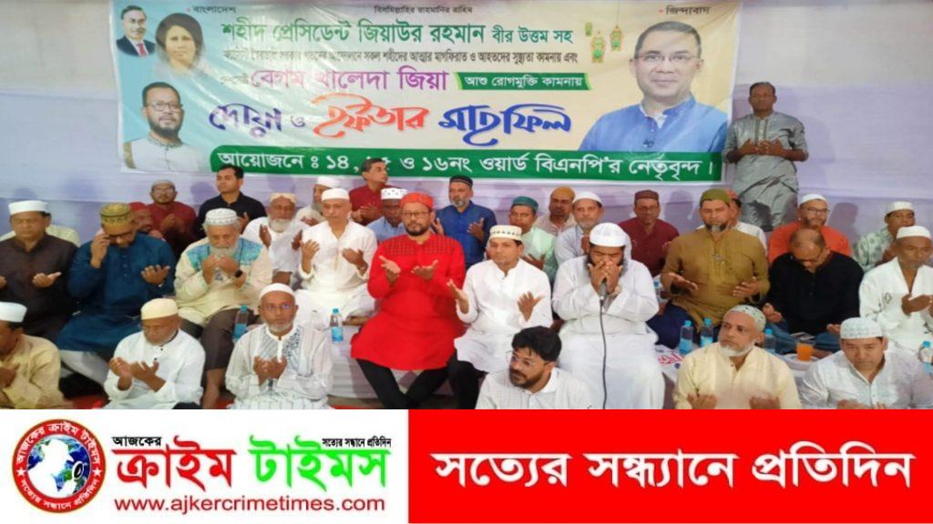 শহীদ প্রেসিডেন্ট জিয়াউর রহমান সহ স্বৈরাচার বিরোধী আন্দোলনে নিহত সকল শহীদদের রুহের মাগফেরাত এবং বিএনপি চেয়ারপার্সন বেগম খালেদা জিয়ার রোগমুক্তি কামনায় মহানগর বিএনপির সাবেক সদস্য সচিব মীর জাহিদুল কবির জাহিদ এর উদ্যোগে দোয়া ও ইফতার মাহফিল অনুষ্ঠিত হয়েছে। গতকাল শুক্রবার ১৪, ১৫ ও ১৬ নং ওয়ার্ড বিএনপির আয়োজনে নব আদর্শ বিদ্যালয় মাঠে এই ইফতার মাহফিলে উপস্থিত ছিলেন বিএনপির জাতীয় নির্বাহী কমিটির সদস্য আলহাজ্ব এবায়েদুল হক চাঁন, বিএনপির সিনিয়র নেতা মুক্তিযোদ্ধা নুরুল আলম ফরিদ, সাবেক ভারপ্রাপ্ত মেয়র কেএম শহিদুল্লাহ, আজকের পরিবর্তনের প্রকাশক ও সম্পাদক কাজী মিরাজ মাহমুদ, বিএনপি নেতা আ.ন.ম সাইফুল হাসান আজিম, পিপি এ্যাড. আবুল কালাম আজাদ, জেলা যুবদলের সাধারন সম্পাদক এইচএম তছলিম উদ্দিন, এ্যাড. আবুল কালাম আজাদ ইমন, ডা: ্আমিনুল ইসলাম, মহানগর যুবদলের সাধারণ সম্পাদক মাজহারুল ইসলাম জাহান, এ্যাড. শেখ মাসুদ, মহানগর স্বেচ্ছাসেবক দলের সদস্য সচিব খান মো. আনোয়ার, স্বেচ্ছাসেবক দল নেতা মাহাবুবুর রহমান পিন্টু সহ বিএনপি ও অঙ্গ সংগঠনের নেতাকর্মীরা।