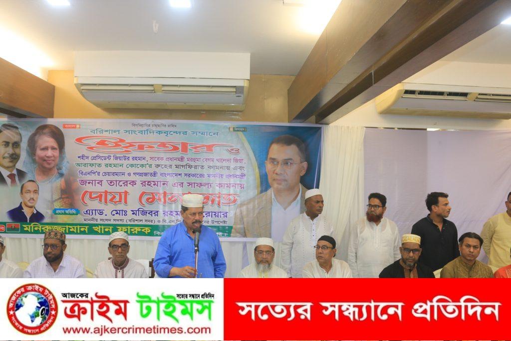 সাংবাদিকদের সম্মানে এবং সাবেক রাষ্ট্রপতি মরহুম জিয়াউর রহমান,সাবেক প্রধানমন্ত্রী মরহুমা বেগম খালেদা জিয়া ও আরাফাত রহমান কোকোর রুহের মাগফিরাত কামনায় ও প্রধান মন্ত্রী তারেক রহমানের সফলতা কামনায় ইফতার মাহফিল অনুষ্ঠিত হয়েছে। মঙ্গলবার বরিশাল ক্লাবে এর আয়োজন করেন বরিশাল মহানগর বিএনপির আহবায়ক মনিরুজ্জামান খান ফারুক। অনুষ্ঠানে প্রধান অতিথি হিসাবে উপস্থিত ছিলেন বরিশাল সদর (৫) আসনের সংসদ সদস্য এ্যাড.মজিবর রহমান সরোয়ার। মনিরুজ্জামান ফারুক’র সভাপতিত্বে অনুষ্ঠানে অন্যান্যদের মধ্যে উপস্থিত ছিলেন মহানগর বিএনপির সদস্য সচিব জিয়া উদ্দিন সিকদার, মহানগরের সাবেক সদস্য সচিব মীর জাহিদুল কবির জাহিদ, মহানগর বিএনপির বিএনপির যুগ্ম আহবায়ক বরিশাল জেলা জজ আদালতের পিপি এ্যাড. আবুল কালাম আযাদ, সদর উপজেলা বিএনপির আহ্বায়ক আলহাজ্ব নুরুল ইসলাম, বরিশাল প্রেসক্লাবের সভাপতি আমিনুল ইসলাম খসরু, সিনিয়র সাংবাদিক মুরাদ আহমেদ, যুগান্তর ব্যুরো প্রধান আকতার ফারুক শাহিন, প্রেসক্লাবের সাবেক সাধারন সম্পাদক আজকের পরিবর্তন সম্পাদক কাজী মিরাজ, গোপাল সরকার, বরিশাল জেলা সাংবাদিক ইউনিয়নের সভাপতি আযাদ আলাউদ্দিন, সিনিয়র সাংবাদিক গিয়াস উদ্দিন সুমনসহ বরিশালে কর্মরত প্রিন্ট ও ইলেকট্রনিক্স মিডিয়ার সাংবাদিকবৃন্দ।