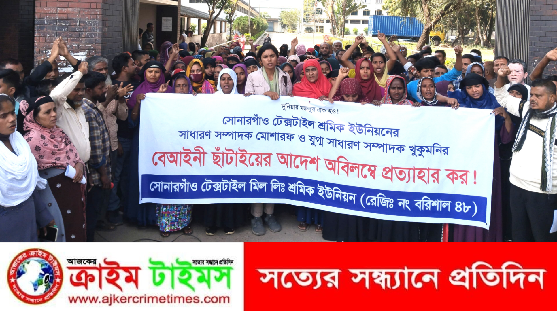 নিজস্ব প্রতিবেদক :: বরিশালের সোনারগাঁও টেক্সটাইলের দুই শ্রমিকনেতাকে ছাঁটাইয়ের প্রতিবাদে দ্বিতীয় দিনের মতো কর্মবিরতি পালন করছেন শ্রমিকেরা। সোমবার (১৬ ফেব্রুয়ারি) দিনভর কারখানার ভেতরে অবস্থান নিয়ে বিক্ষোভ করেন তাঁরা। পরে কারখানা ফটকে সংবাদ সম্মেলন করে ওই দুই নেতাকে কাজে ফেরানোর দাবি জানানো হয়। অন্যথায় কঠোর কর্মসূচির হুঁশিয়ারি দেওয়া হয়েছে।