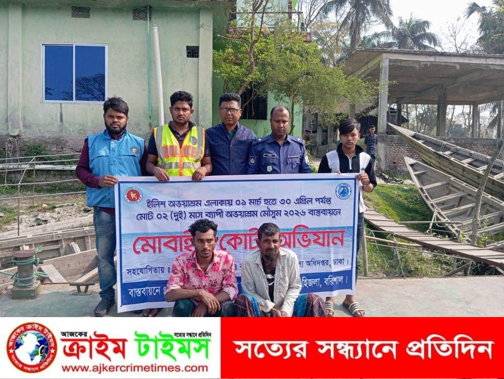 পরিস্থিতি নিয়ন্ত্রণে এনে অভিযান চালিয়ে একটি ট্রলারসহ বেহুন্দী জাল ও দুটি লোহার অ্যাংকর জব্দ করা হয়। এ সময় দুই জেলে—মো. মারুফ হোসেন (২৪), পিতা: আব্দুল কাদের মাঝি, গ্রাম: উলানিয়া, মেহেন্দিগঞ্জ এবং মো. জাহাঙ্গীর মাঝি (৫০), পিতা: আব্দুল জলিল মাঝি, গ্রাম: বালিয়া, উলানিয়া, মেহেন্দিগঞ্জ—কে আটক করা হয়।