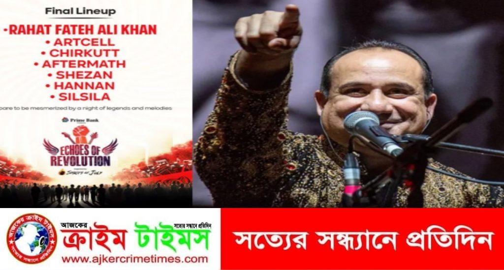 আগামী ২১ ডিসেম্বর জুলাই-আগস্ট অভ্যুত্থানে শহীদ ও আহতদের পরিবারকে সহায়তার জন্য রাজধানী ঢাকার আর্মি স্টেডিয়ামে অনুষ্ঠিত হতে যাচ্ছে ‘ইকোস অব রেভল্যুশন’ শীর্ষক কনসার্ট। এতে বিনা পারিশ্রমিকে পারফর্ম করবেন জনপ্রিয় পাকিস্তানি সংগীতশিল্পী রাহাত ফতেহ আলী খান। অনুষ্ঠানটির আয়োজন করছে ‘স্পিরিটস অব জুলাই’ প্ল্যাটফর্ম।