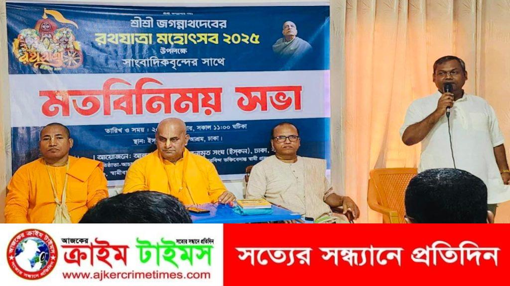 সনাতন ধর্মাবলম্বীদের অন্যতম ধর্মীয় অনুষ্ঠান শ্রী শ্রী জগন্নাথদেবের রথযাত্রা উৎসব শুরু হচ্ছে আগামী শুক্রবার। বুধবার দুপুরে রাজধানীর ইসকন-স্বামীবাগ মন্দিরে ‘রথযাত্রা উৎসব উদযাপন উপলক্ষে’ মতবিনিময় সভা অনুষ্ঠিত হয়েছে। এতে ইসকন বাংলাদেশের সাধারণ সম্পাদক চারু চন্দ্র দাস বক্তব্য রাখেন।