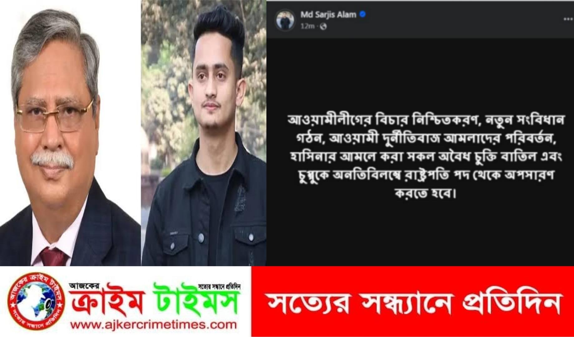 বৃহস্পতিবার (৩ অক্টোবর) রাত ৯টায় এক ফেসবুক পোস্টে তিনি এই দাবি জানান।সারজিস আলম পোস্টে লেখেন, আওয়ামী লীগের বিচার নিশ্চিতকরণ, নতুন সংবিধান গঠন, আওয়ামী দুর্নীতিবাজ আমলাদের পরিবর্তন, হাসিনার আমলে করা সকল অবৈধ চুক্তি বাতিল এবং চুপ্পুকে অনতিবিলম্বে রাষ্ট্রপতি পদ থেকে অপসারণ করতে হবে।