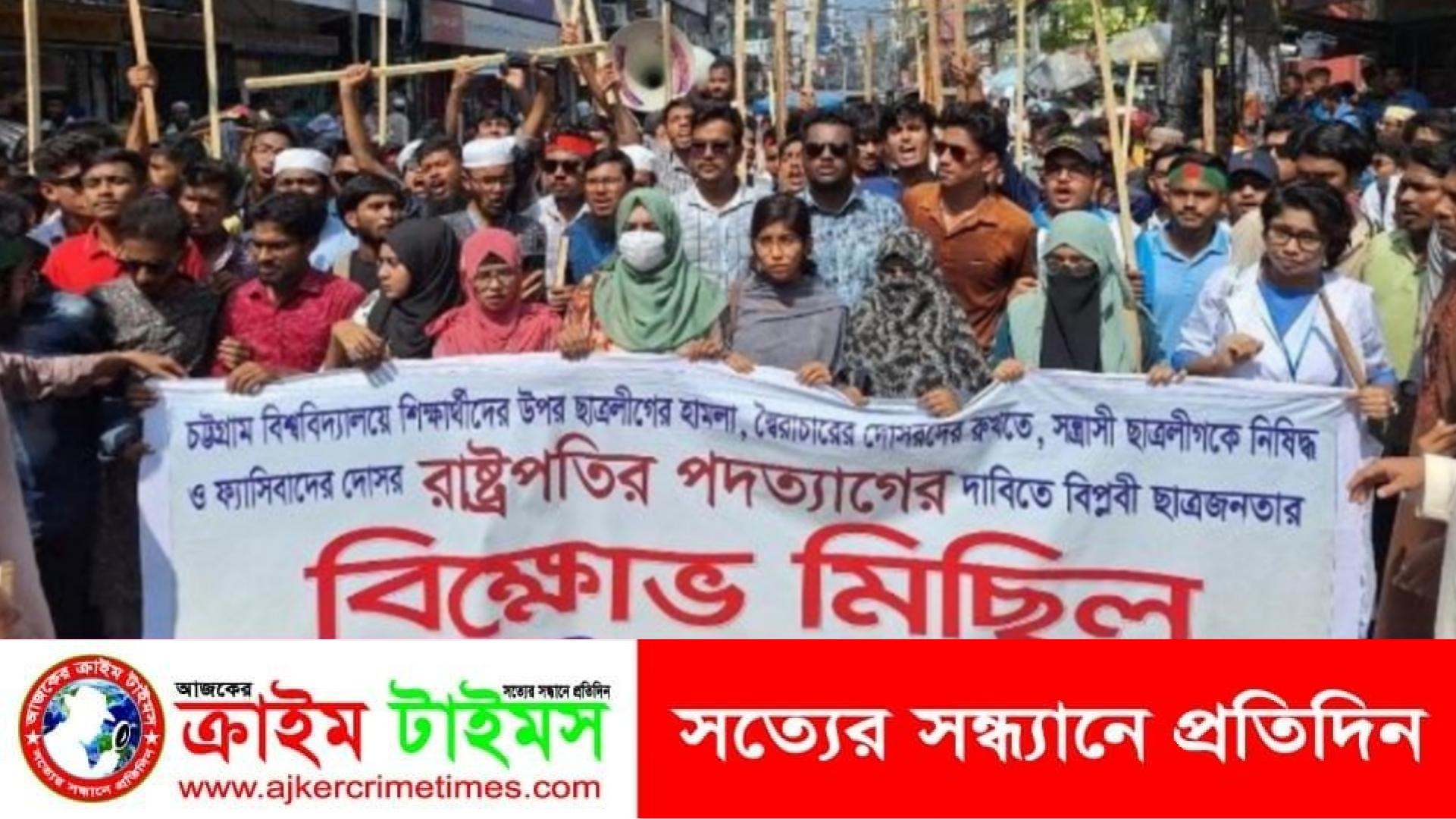 এ সময় শিক্ষার্থীরা আরো বলেন, আবু সাঈদ, মুগ্ধসহ আমাদের ভাইরা জীবনকে বিলিয়ে দিয়ে শহিদ হয়ে স্বৈরাচারের পতন ঘটিয়েছে। কিন্তু সন্ত্রাসী সংগঠন ছাত্রলীগ এখনও সারাদেশের বিভিন্ন জায়গায় নৈরাজ্য সৃষ্টি করছে। তারা সাধারণ শিক্ষার্থীদের ওপর হামলা চালাচ্ছে। তাই সন্ত্রাসী সংগঠনকে অনতিবিলম্বে নিষিদ্ধ ঘোষণা করতে হবে। আমরা আজও যে দাবির কথা বলছি তা জনগণের কথা। চট্টগ্রাম বিশ্ববিদ্যালয়ের শিক্ষার্থীদের ওপর ছাত্রলীগের হামলা, স্বৈরাচারের দোসরদের রুখতে, সন্ত্রাসী ছাত্রলীগকে নিষিদ্ধ ও ফ্যাসিবাদের দোসর রাষ্ট্রপতির পদত্যাগ দাবি করছি আমরা।