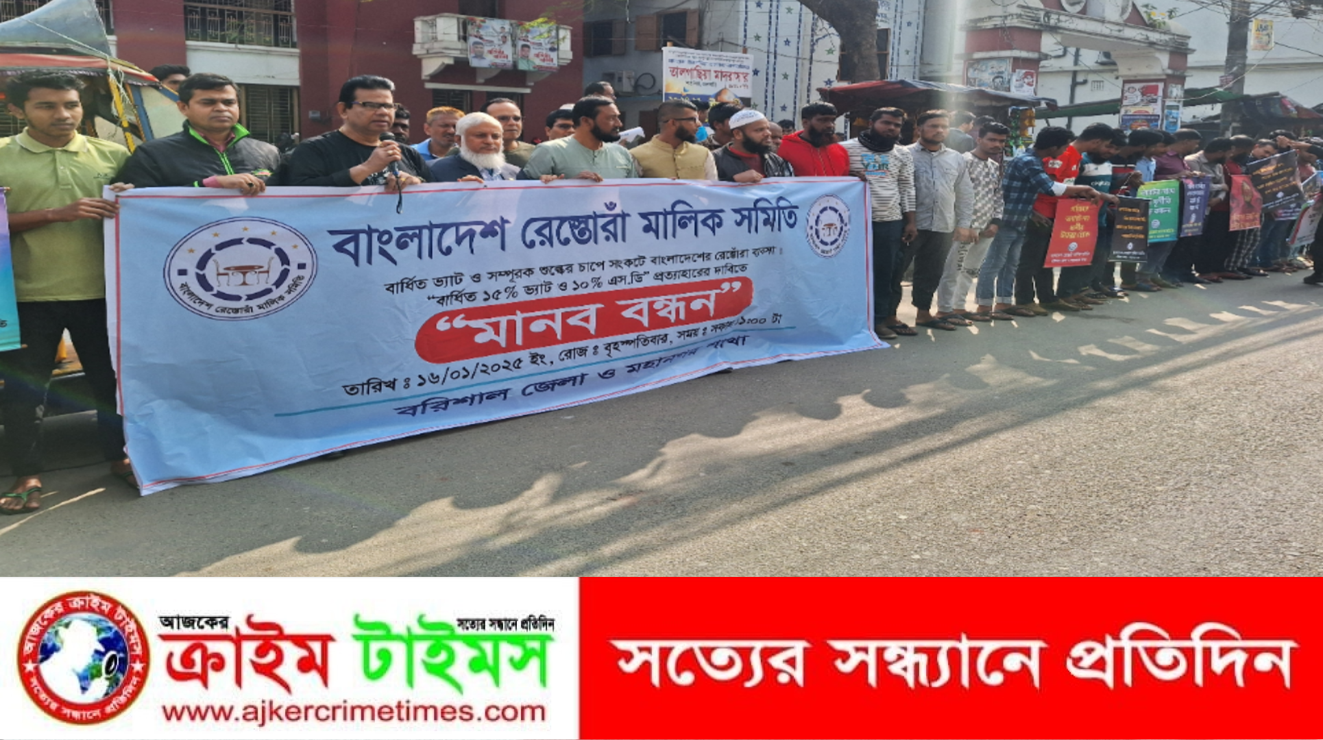 বৃহস্পতিবার বেলা ১১ টায় নগরের অশ্বিনী কুমার টাউনহলের সামনে বাংলাদেশ রেস্তোরাঁ সমিতি বরিশাল জেলা ও মহানগর শাখার আয়োজনে এ কর্মসূচি পালন করা হয়। বাংলাদেশ রেস্তোরাঁ সমিতি বরিশাল জেলা ও মহানগর শাখার সভাপতি বিশ্বজিৎ ঘোষ বিষুর সভাপতিত্বে মানববন্ধনে বক্তারা বলেন, বর্তমান সরকার হঠাৎ করে অর্থবছরের মাঝামাঝি সময়ে রেস্তোরাঁ খাতে ভ্যাটের হার তিনগুণ বৃদ্ধির সিদ্ধান্ত নিয়েছে। যেখানে দীর্ঘদিন ধরে দেশে উচ্চ মূল্যস্ফীতি বিরাজ করছে, সেখানে হঠাৎ করে ব্যবসায়ীদের সাথে কোনো আলোচনা না করে তৈরি পোশাক, রেস্তোরাঁ, মিষ্টিসহ ৪৩ টি পণ্য ও সেবার উপরে মূল্য সংযোজন কর (মূসক) বা ভ্যাট বাড়ানোর সিদ্ধান্তটি সম্পূর্ণ হঠকারী সিদ্ধান্ত বলে আমরা মনে করি। বর্তমানে বাজারে দ্রব্যমূল্যের যা অবস্থা এ দিয়ে ব্যবসা করাটা আমাদের খুব কষ্টকর। তারপরেও আমরা সরকারকে ৫ শতাংশ ভ্যাট দেই। বরং আমাদের দাবি ছিল যাতে করে এ ভ্যাট কমিয়ে তিন শতাংশ করার কিন্তু বছরের মাঝামাঝি সময়ে হঠকারী এ সিদ্ধান্তের ফলে অনেক ব্যবসায়ীর ব্যবসা বন্ধের পথে। সরকার ব্যবসায়ীবান্ধব না হয়ে হঠাৎ করে তিনগুণ অর্থাৎ ১৫ শতাংশ ভ্যাট বৃদ্ধি করেছে।
