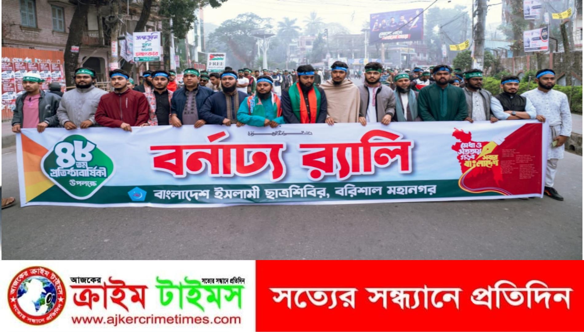 ৪৮ তম প্রতিষ্ঠাবার্ষিকী উপলক্ষে বর্ণাঢ্য র্যালি ও সমাবেশের আয়োজন করেছে বরিশাল মহানগর ছাত্রশিবির। গতকাল বৃহস্পতিবার সকাল ১০টায় নগরীর জিলাস্কুল মোড় থেকে শুরু হওয়া র্যালিটি বিভিন্ন সড়ক প্রদক্ষিণ করে টাউনহলের সামনে গিয়ে জজড়ো হয়।