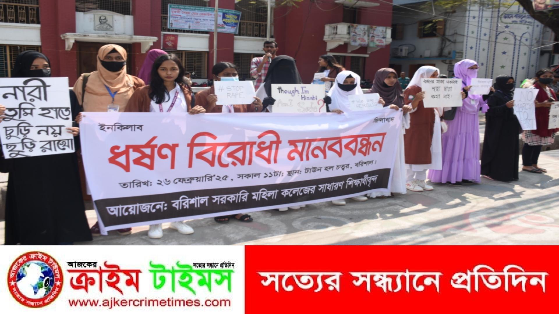 নিজস্ব প্রতিবেদক :: ধ.র্ষ.কের দ্রুত বিচারসহ ৭ দফা দা.বিতে বরিশাল মহিলা কলেজের শিক্ষার্থীদের মা.নবব.ন্ধন।
