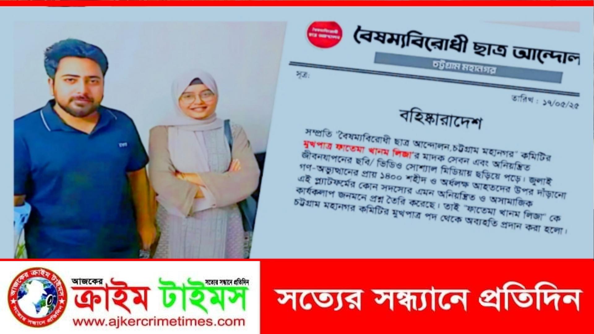 মাদক সেবন ও অসামাজিক কার্যকলাপের অভিযোগে বৈষম্যবিরোধী ছাত্র আন্দোলন চট্টগ্রাম মহানগর কমিটির মুখপাত্র ফাতেমা খানম লিজাকে সংগঠন থেকে বহিষ্কার করা হয়েছে।