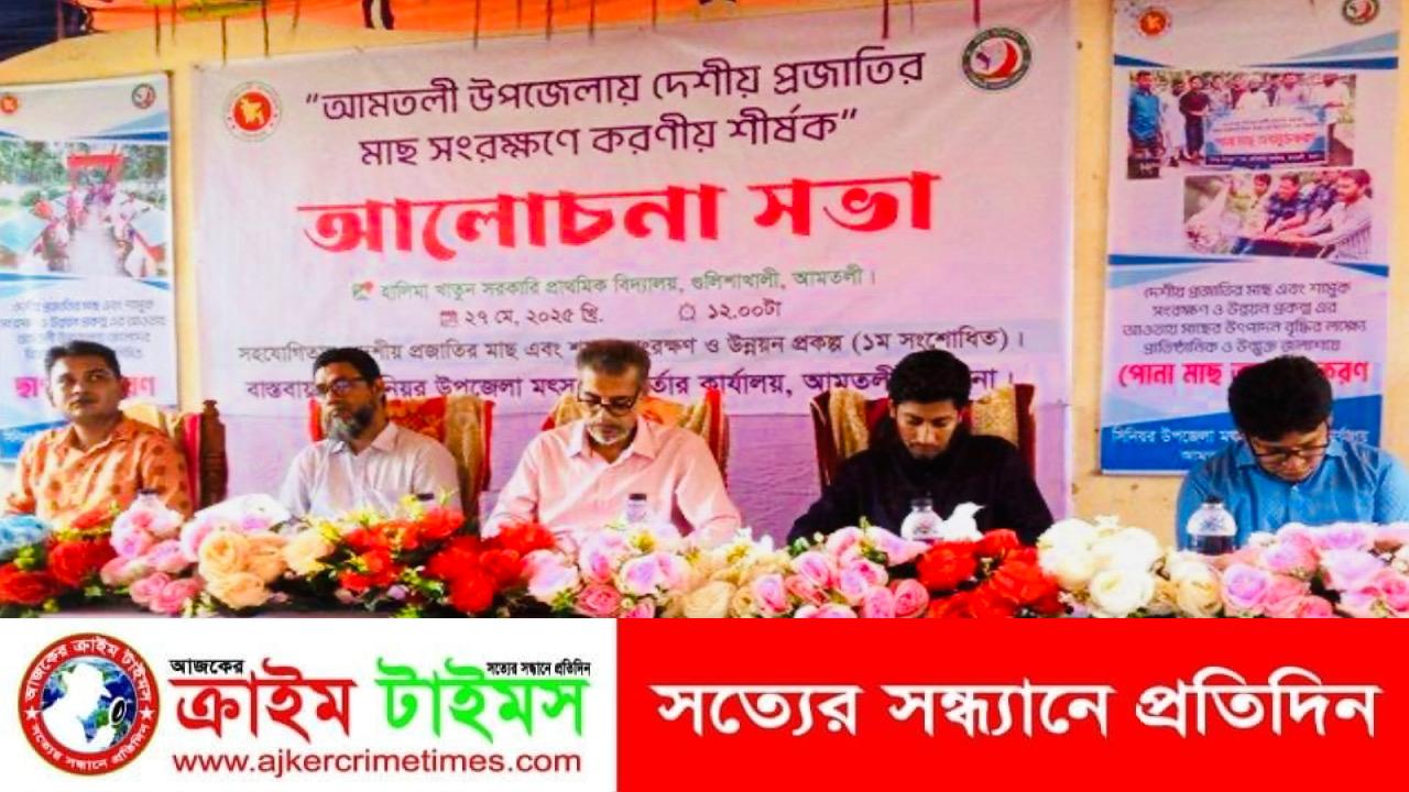 নিজস্ব প্রতিবেদক :: বরগুনার আমতলী উপজেলা মৎস্য বিভাগের উদ্যোগে দেশীয় প্রজাতির মাছ এবং সামুক সংরক্ষন ও উন্নয়ন প্রকল্পের আওতায় ২০২৪-২০২৫ অর্থবছরে আমতলী উপজেলার গুলিশাখালী ইউনিয়নের মৎস্যজীবিদের নিয়ে মঙ্গলবার দুপুর আড়াইটার দিকে হালিমা খাতুন সরকারী প্রাথমিক বিদ্যালয় মিলনায়তনে ইউনিয়ন পর্যায়ে উদ্ভুদ্ধকরন ও আলোচনা সভা অনুষ্ঠিত হয়েছে।