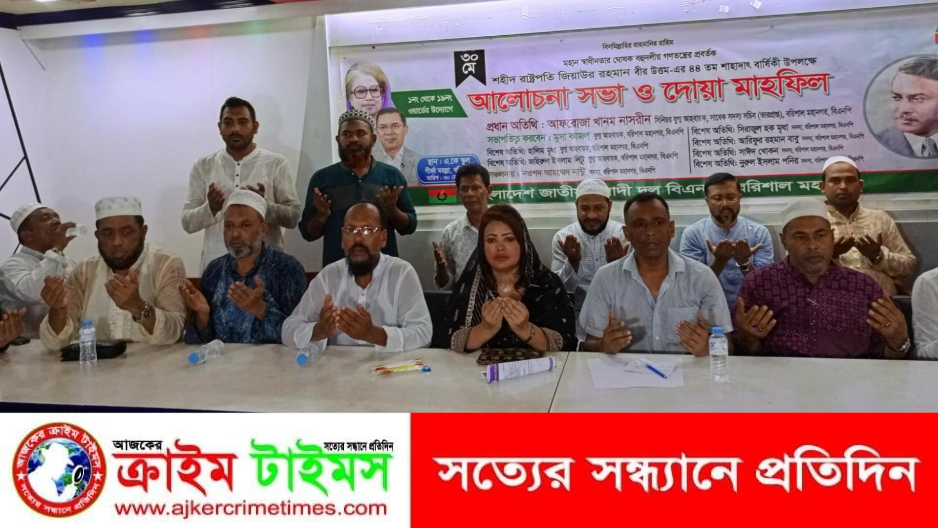শহীদ রাষ্ট্রপতি জিয়াউর রহমান বীর উত্তম-এর ৪৪তম শাহাদাত বার্ষিকী উপলক্ষে বরিশালে দোয়া ও মোনাজাত অনুষ্ঠিত হয়েছে। বরিশাল মহানগর বিএনপির যুগ্ম আহ্বায়ক আফরোজ খানম নাসরিনের উদ্যোগে এই দোয়া মাহফিলের আয়োজন করা হয়।