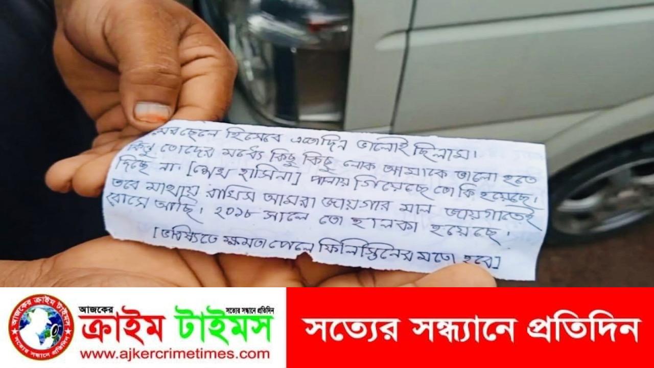 গাংনী থানা পুলিশের উপ পরিদর্শক (এসআই) আব্দুল করিম বলেন, উদ্ধারকৃত চিরকুটে লেখা রয়েছে- ‘শেখ হাসিনা পালিয়ে গেছে তো কি হয়েছে জায়গার মাল জাইগায় বসে আছি। ভবিষ্যতে ক্ষমতা পেলে ফিলিস্তিনের মতো হবে। গাংনী থানার ভারপ্রাপ্ত কর্মকর্তা (ওসি) বাণী ইসরাইল জানান, খবর পেয়ে আমরা ঘটনাস্থল পরিদর্শন করে দুটি বোমা সদৃশ বস্তু ও চিরকুট উদ্ধার করে থানায় নিয়েছি। পরবর্তীতে আইনানুগ ব্যবস্থা নেওয়া হবে।