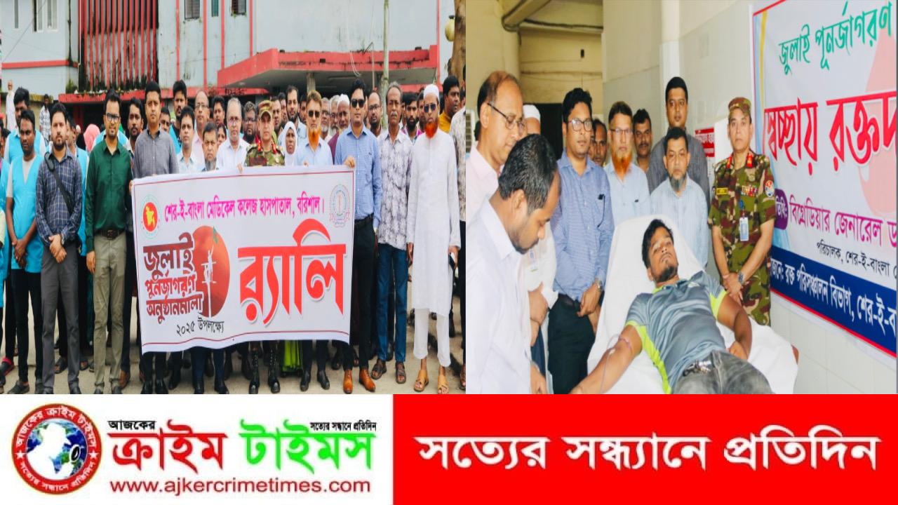 নিজস্ব প্রতিবেদক :: জুলাই পুনর্জাগরণ অনুষ্ঠানমালা ২০২৫ উপলক্ষ্যে বরিশাল শের-ই-বাংলা মেডিকেল কলেজ হাসপাতালের উদ্যোগে র্যালি ও স্বেচ্ছায় রক্তদান কর্মসূচি পালন করা হয়েছে। এসময় এক আলোচনা সভাও অনুষ্ঠিত হয়।