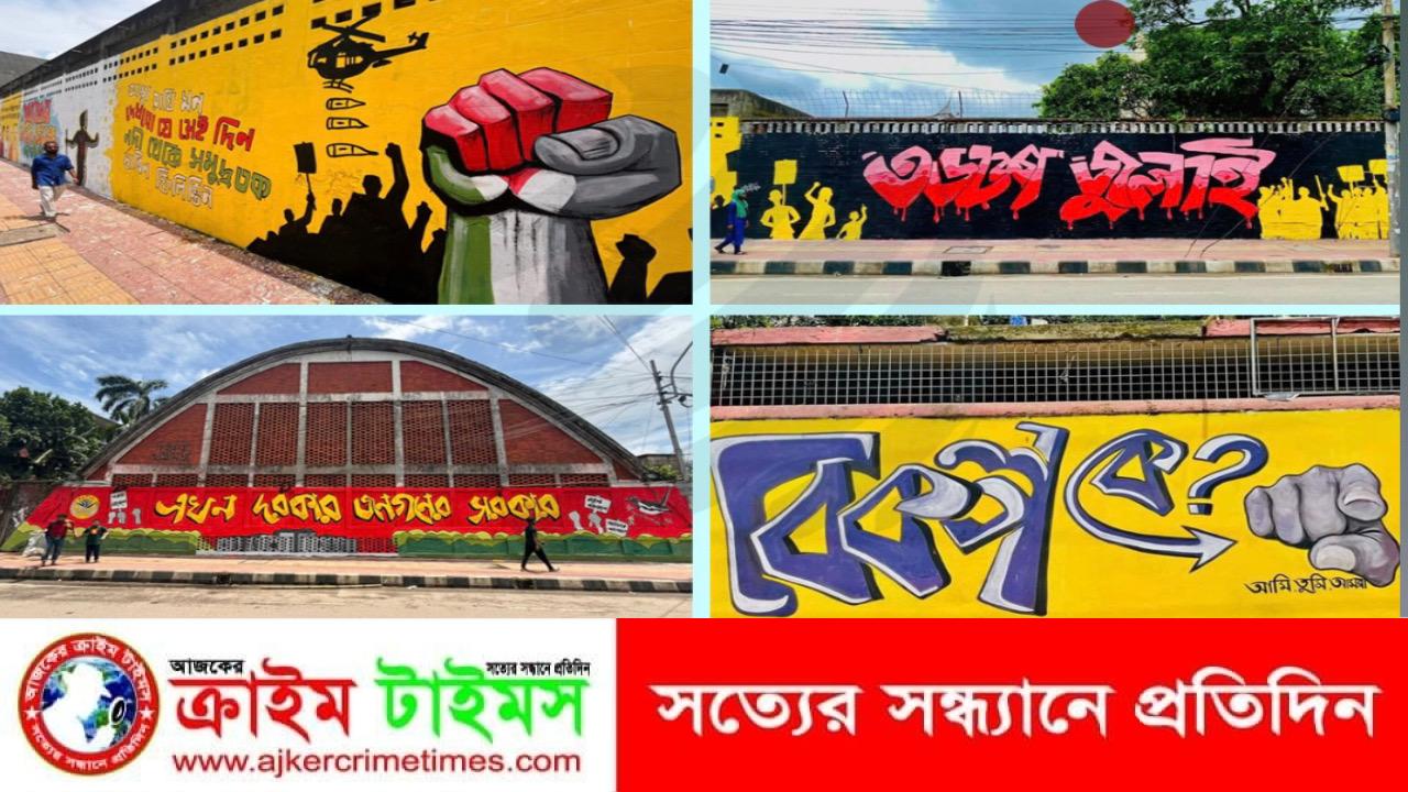 এরপর বদলে যেতে থাকে শহরের দেয়ালের চিত্র। কোটা আন্দোলনের স্লোগান থেকে গণঅভ্যুত্থানের প্রতীক— সবই ফুটে ওঠে স্কুল-কলেজপড়ুয়াদের আঁকা গ্রাফিতিতে। একেকটি দেয়াল হয়ে ওঠে একেকটি ক্যানভাস আর প্রতিটি আঁচড়ে লেখা হয় রক্তাক্ত জুলাইয়ের উপাখ্যান। রক্তাক্ত জুলাইয়ের এক বছর অতিবাহিত হয়েছে। তবে, এখনো ঢাকার দেয়ালে জীবন্ত সেই ইতিহাস, যা মনে করিয়ে দিচ্ছে আন্দোলনে দাবানলে পরিণত হওয়া সেসব দিনের কথা।