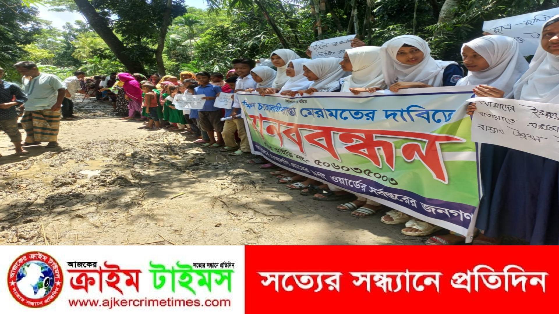 বাবুগঞ্জে সড়ক পাকা করনের দাবিতে ৩টি স্কুলের শিক্ষার্থী ও গ্রামবাসীর মানববন্ধন