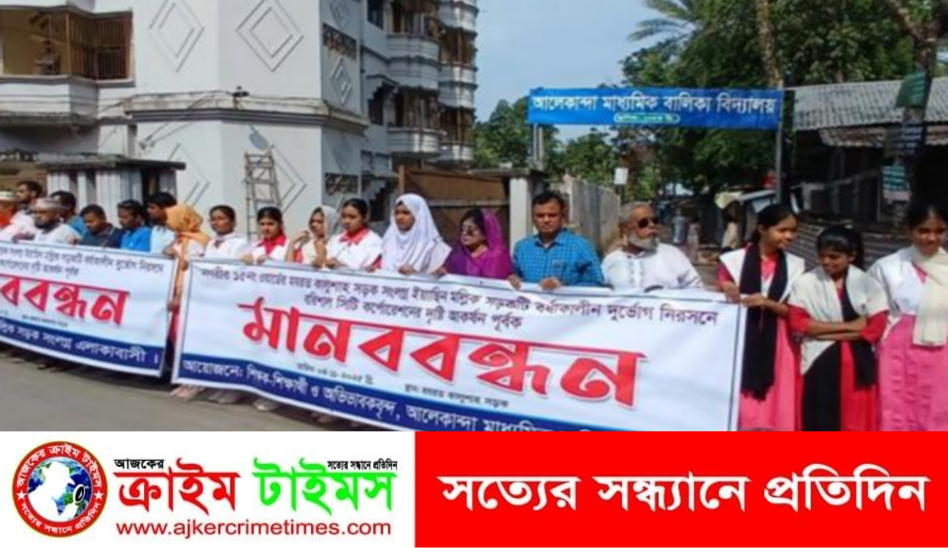 বরিশালে রাস্তা সংস্কারের দাবিতে আলেকান্দা বালিকা মাধ্যমিক বিদ্যালয়ের শিক্ষক-শিক্ষার্থীদের মানববন্ধন