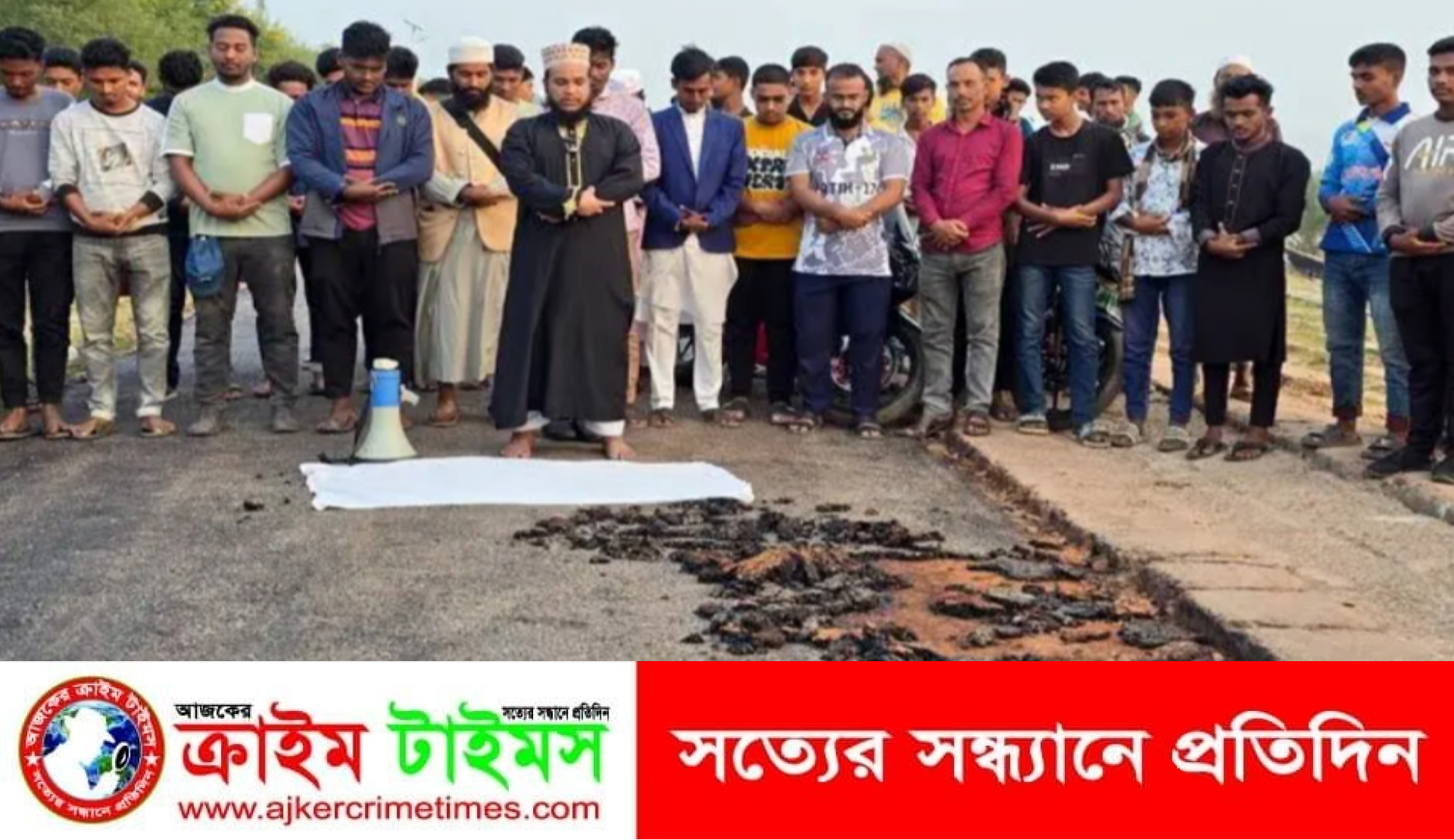 নিজস্ব প্রতিবেদক :: কুয়াকাটায় রাস্তার ‘আত্মার মাগফেরাত’ কামনায় গায়েবানা জানাজা! কার্পেটিং উঠে যাওয়া রাস্তায় কাফনের কাপড় বিছিয়ে প্রতীকী গায়েবানা জানাজা পড়া হয়।