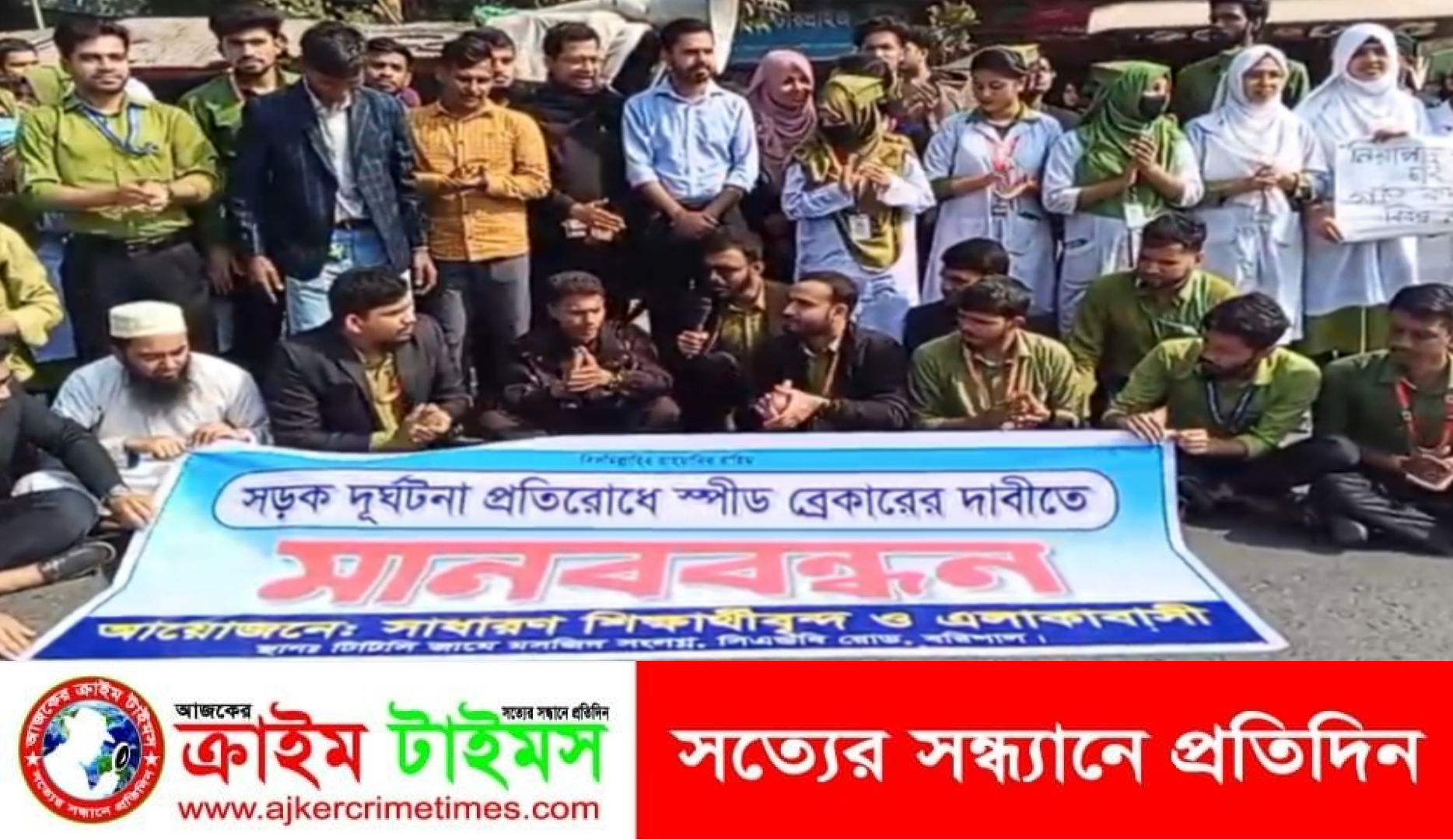 নগরীর টিটিসি জামে মসজিদ সংলগ্ন সিঅ্যান্ডবি রোড এলাকায় সড়ক দূর্ঘটনা প্রতিরোধে ৮ ই ডিসেম্বর সোমবার সকাল ১১ ঘটিকা থেকে ঘন্টা ব্যাপী সাধারণ শিক্ষার্থী ও এলাকাবাসীর উদ্যোগে এ মানববন্ধন আয়োজন করা হয়।