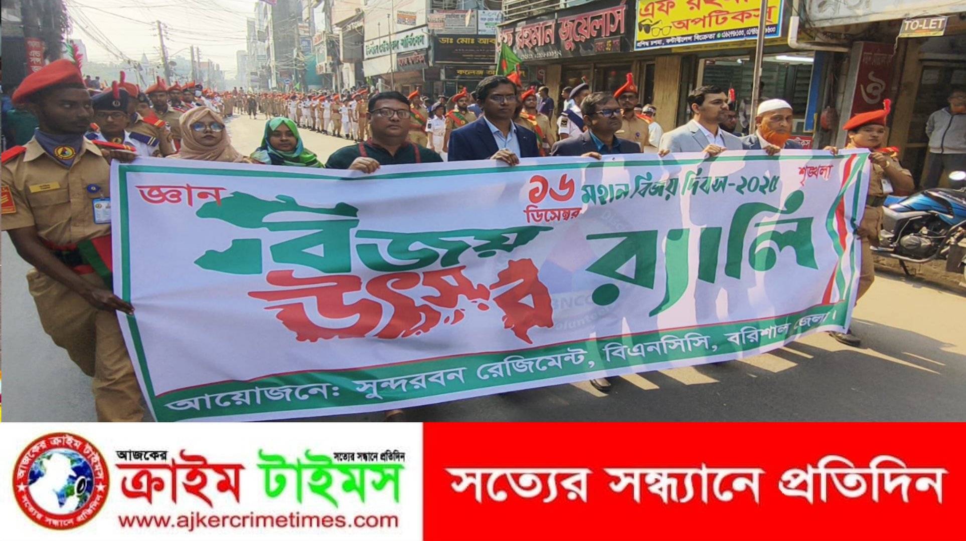 মহান বিজয় দিবস উপলক্ষে বরিশাল জেলায় সেনা ও নৌ শাখার বিএনসিসি চৌকস ক্যাডেটদের অংশগ্রহণে এক বর্ণাঢ্য আনন্দ-র‍্যালি অনুষ্ঠিত হয়েছে। ২৫ বিএনসিসি ব্যাটালিয়ন, সুন্দরবন রেজিমেন্টের উদ্যোগে আয়োজিত এই র‍্যালিতে ক্যাডেটদের শৃঙ্খলাবদ্ধ পদচারণা ও দেশপ্রেমমূলক স্লোগানে মুখরিত হয়ে ওঠে নগরী।