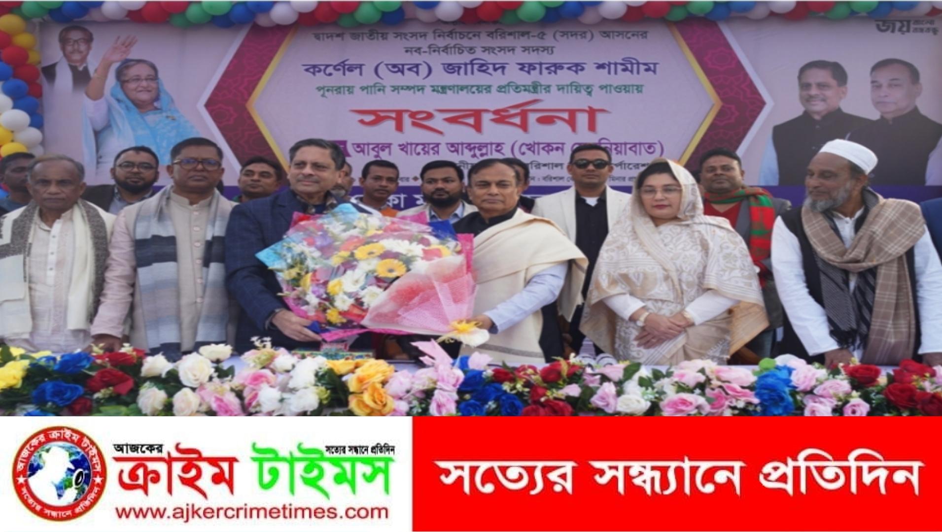 শনিবার বরিশালে পানিসম্পদ প্রতিমন্ত্রী কর্নেল (অবসরপ্রাপ্ত) জাহিদ ফারুক শামীমকে সংবর্ধনা দেওয়া হয়। নৌকা মার্কার নির্বাচন পরিচালনা কমিটি আয়োজিত সংবর্ধনা অনুষ্ঠানে প্রতিমন্ত্রী বক্তব্য রাখতে গিয়ে এসব সম্ভবনার কথা জানিয়েছেন। অনুষ্ঠানে সভাপতিত্ব করেন বরিশাল সিটি মেয়র আবুল খায়ের আব্দুল্লাহ খোকন সেরনিয়াবাত।