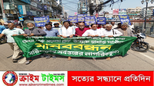 বরিশালের বেলস পার্কের লেকের চারপাশে দেয়াল নির্মাণ বন্ধের দাবিতে মানববন্ধন